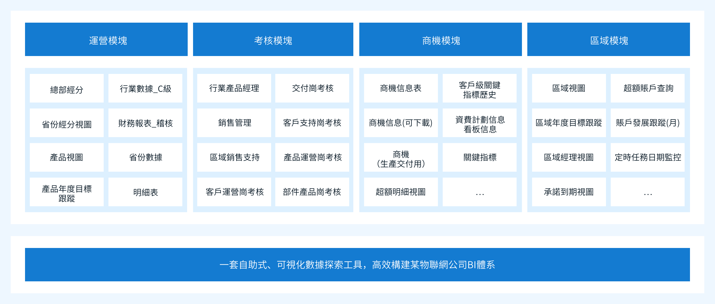 AK在线注册数据探索分析平台(AISWare DataDiscovery) 帮助该物联网公司快速构建公司级BI经营分析体系,支撑公司级商机管理、运营管理、分区域运营分析、考核管理等企业经营分析工作。