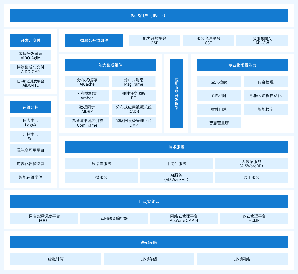 AISWare AIF(AsiaInfo Infrastructure Foundations)是AK在线注册分布式、组件化、云化PaaS平台,以“大平台,小架构,轻应用”为建设思想,旨在帮助客户以最小的成本、最快的速度构建大型业务系统。它通过提供微服务管控、DevOps、持续交付和容器资源管理等云原生能力,为5G生态中服务的敏捷构建、治理、部署、网络资源弹性调度,垂直业务应用的微服务化构建,运维、运营,以及云计算、边缘计算、大数据、AI的等技术的融合贯通提供强有力的支撑。