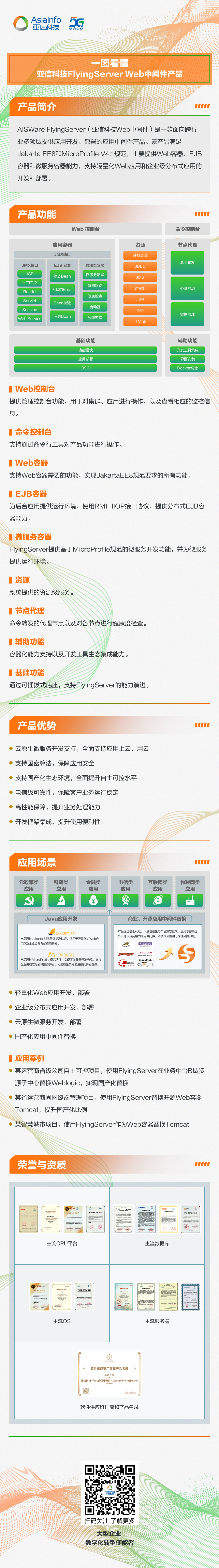 FlyingServer是国产化Web中间件,自主可控,满足Jakarta EE 10标准,支持 WAR、EAR、JAR 等应用部署,作为应用容器,适用于单机及集群环境,可承载各类Java应用,满足多场景需求,已通过信创测试,获多个信创产品兼容互认。