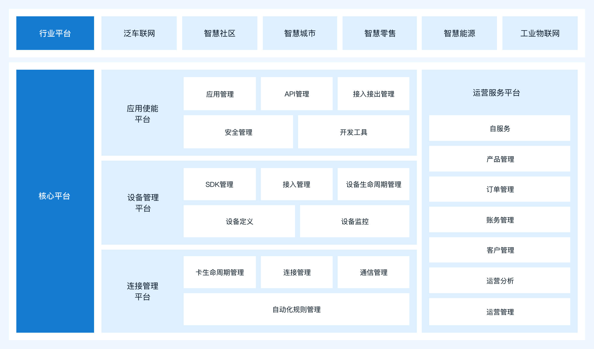 为客户提供网络连接、设备接入与控制、设备资产及其使用管理等功能,整合生态能力并对外开放,实现对客户物联网业务运营的安全、高效、智慧的支撑。